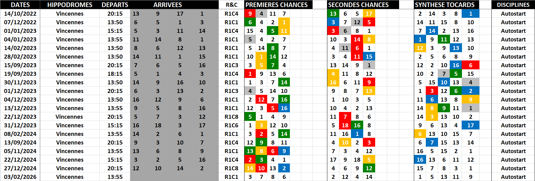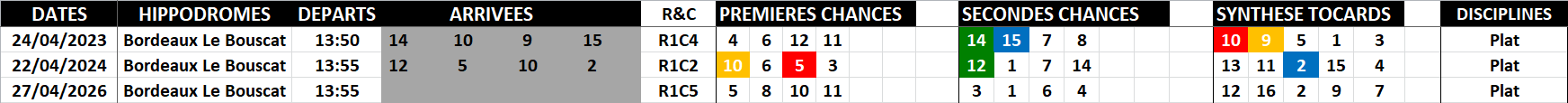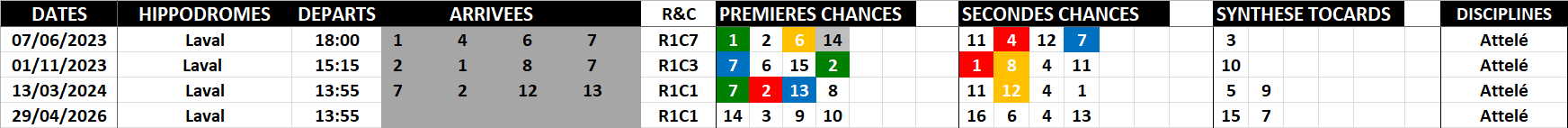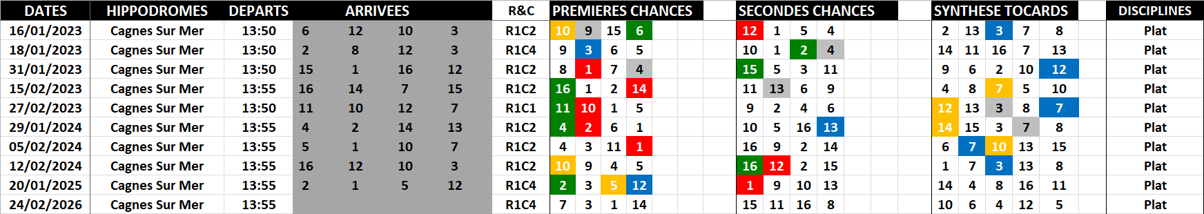 Comme infos classiques, j’y introduis la date, le jour, l’hippodrome, le nombre de partants, l’allocation, la discipline, la distance, la R&C (Réunion et Course), l’heure de départ et l’arrivée comme c’est le cas dans cette image.