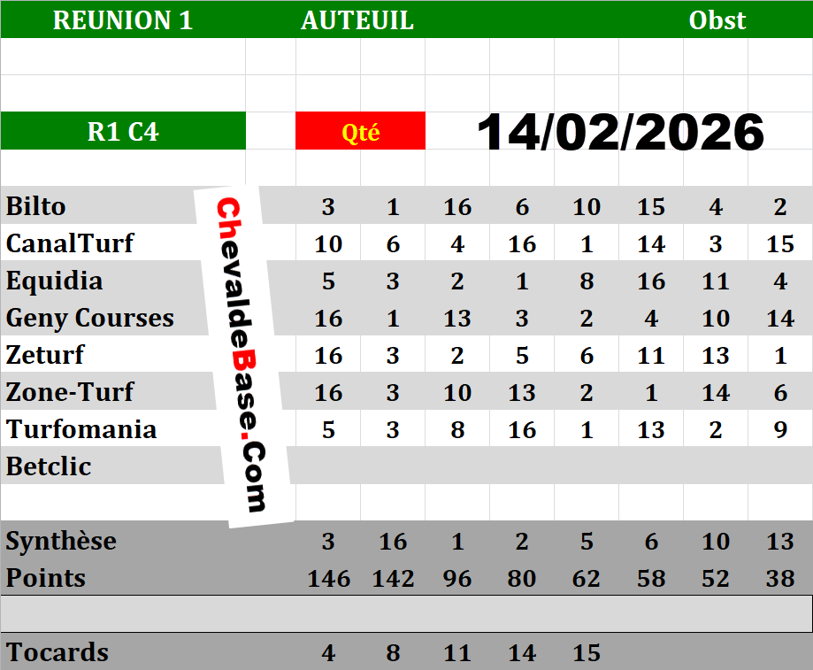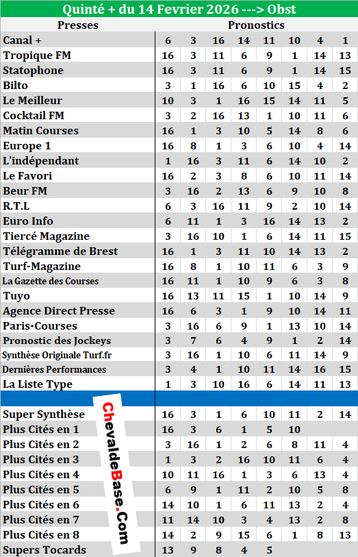 Petites exceptions les jours de Nocturnes où ils sont régulièrement actualisés entre 10 et 12 heures GMT...Pronostic Quinté de SAMEDI 14/02/2026 | Bases |