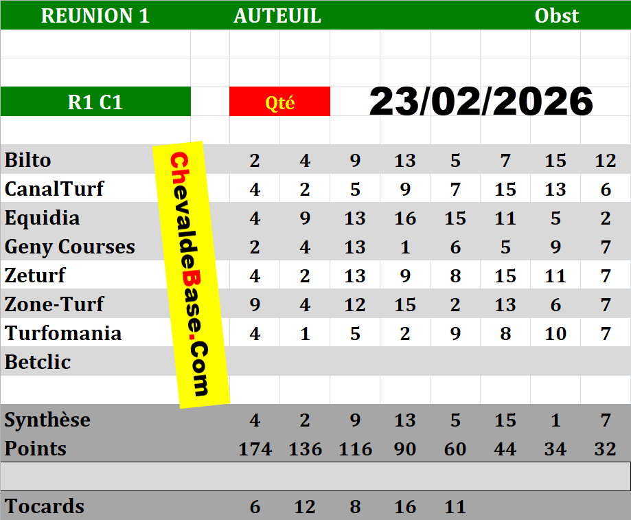 Petites exceptions les jours de Nocturnes où ils sont régulièrement actualisés entre 10 et 12 heures GMT...Pronostic Quinté de LUNDI 23/02/2026 | Bases |