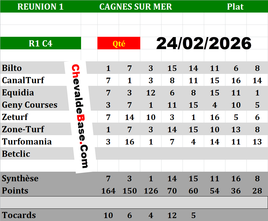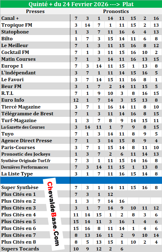 Petites exceptions les jours de Nocturnes où ils sont régulièrement actualisés entre 10 et 12 heures GMT...Pronostic Quinté de MARDI 24/02/2026 | Bases |