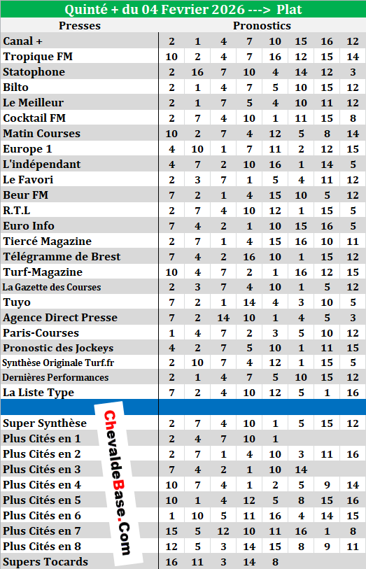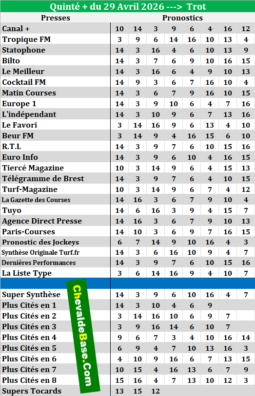 Voici une liste de pronostics qui devrait vous plaire. Plus intéressant encore, vous ne recevez pas QUE les pronostics de la presse, mais aussi 10 de leurs meilleures synthèses gratuites : une synthèse logique et 9 autres synthèses simples (des plus cités aux tocards) qui vous seront particulièrement utiles suivant le type de jeu qui vous convient. Je vous laisse en faire bon usage. 🙂